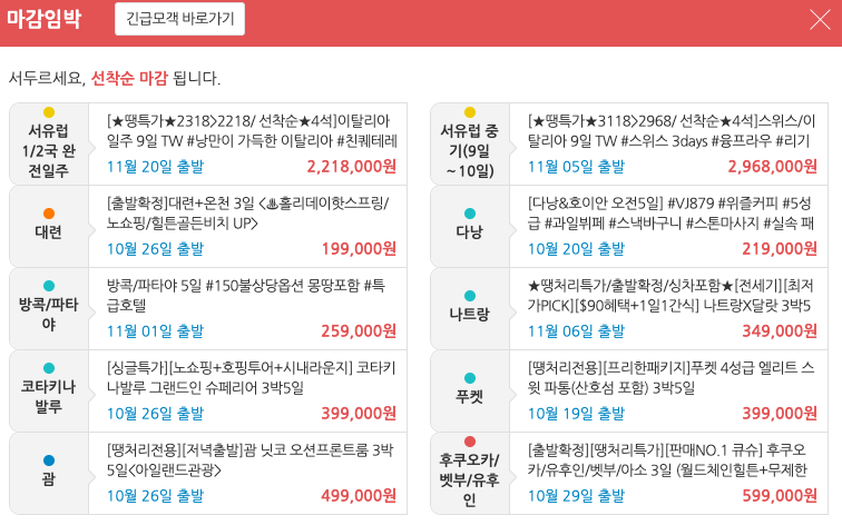 * 당시 마감임박 상품을 보고 무작정 떠났었는데, 지금도 다양한 마감임박 땡처리 여행 상품들을 볼 수 있습니다.