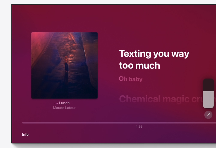 또한, tvOS 18에서는 대화 강조 기능이 한층 스마트해집니다. 머신 러닝과 컴퓨테이셔널 오디오 기술을 활용해 Apple TV 4K에서 음악, 동작 및 배경 소음보다 음성을 더욱 또렷하게 들려줍니다. 자막 기능도 향상되어, 프로그램이나 영화의 언어가 기기에 설정된 언어와 다른 경우, 콘텐츠를 음소거하거나 시청 중이던 콘텐츠를 앞으로 건너뛴 경우 등 자막이 꼭 필요한 순간에 자동으로 표시됩니다.