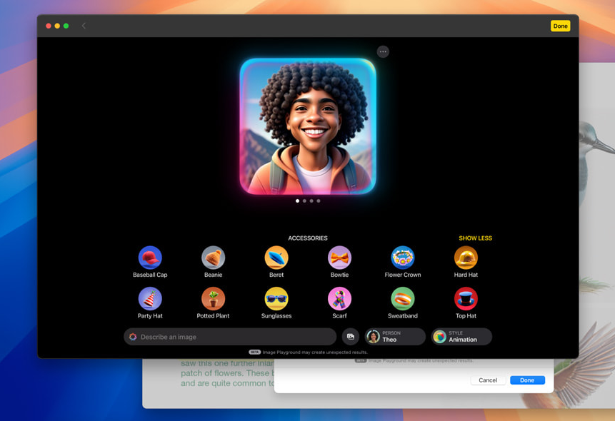• 생성 스타일: 현대적인 3D 만화, 애니메이션, 명확한 선과 컬러 블로킹을 활용한 독창적인 일러스트 제공. - 젠모지 (Genmoji) – 개인 맞춤형 이모티콘 생성