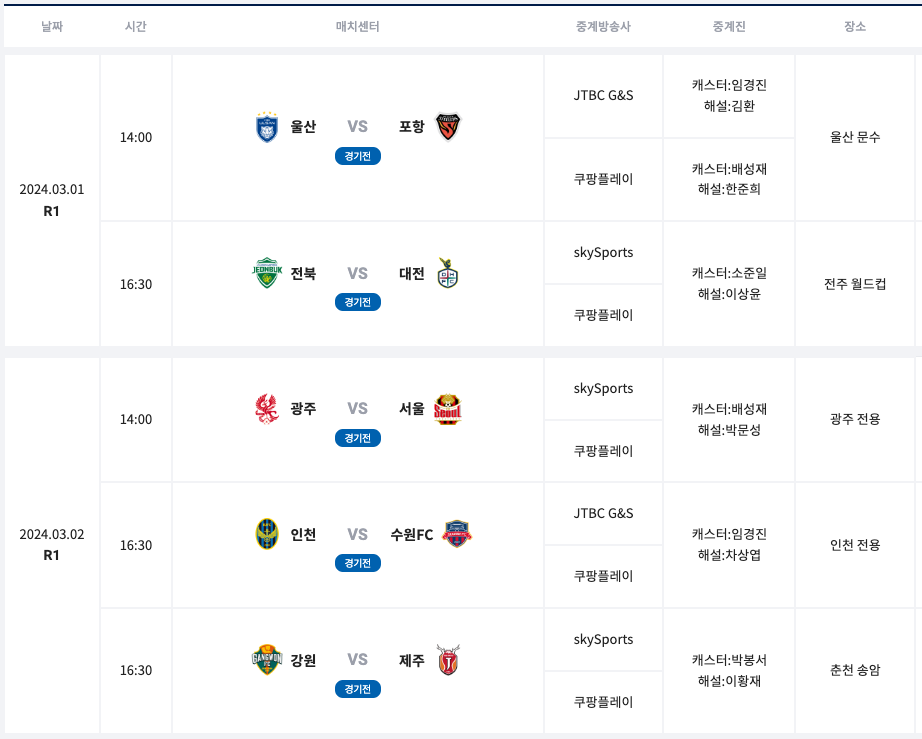 하나은행 K리그 2024 시즌 개막전은 3월 1일 오후 2시 울산과 포항의 경기이고, 이어 전북과 대전, 다음날은 광주와 서울, 인천과 수원FC, 강원과 제주의 경기가 있습니다.