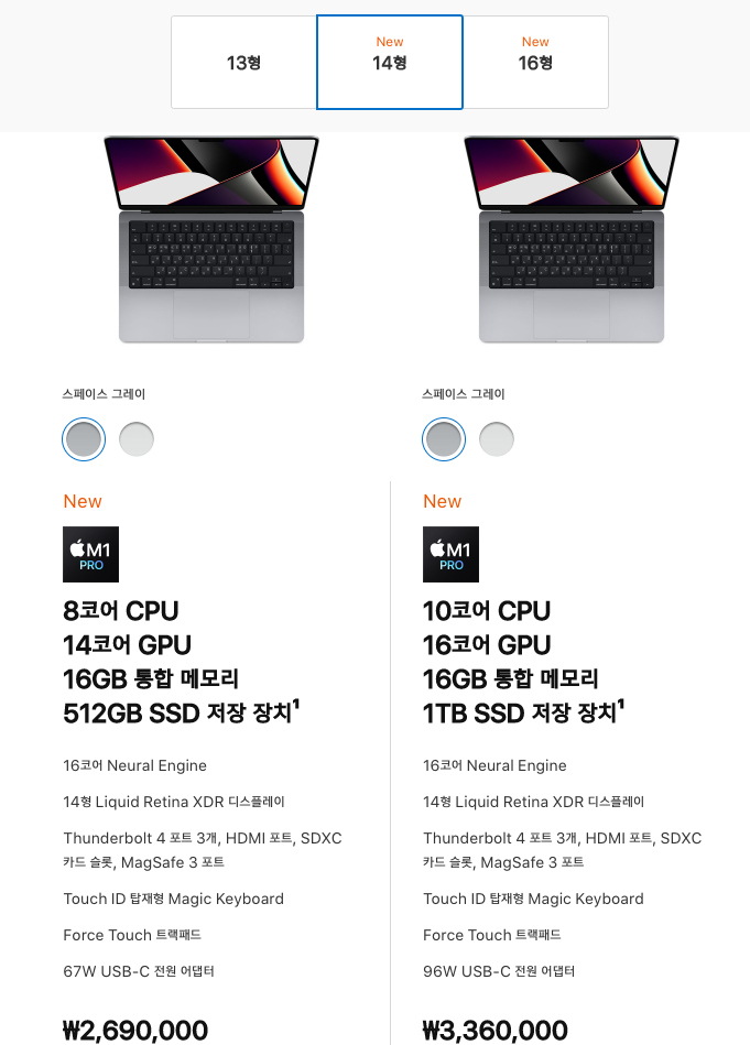 색상은 실버와 스페이스 그레이 2종류이고, M1 MacBook Pro 14형의 가격은 269만원부터, 16형은 336만원부터입니다. 먼저 가장 저렴한 모델인 M1 Pro 칩의 맥북 프로 14인치 스펙입니다.