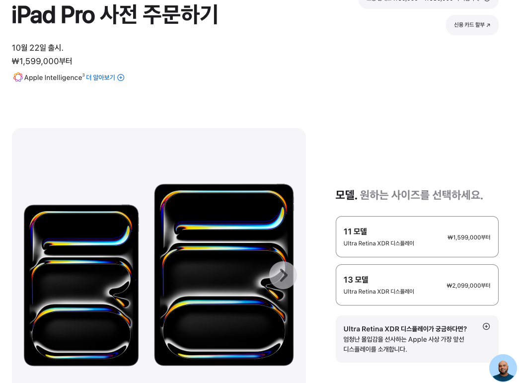 • iPad Pro 13형: 2,099,000원(Wi-Fi) / 2,399,000원(Wi-Fi+Cellular)~