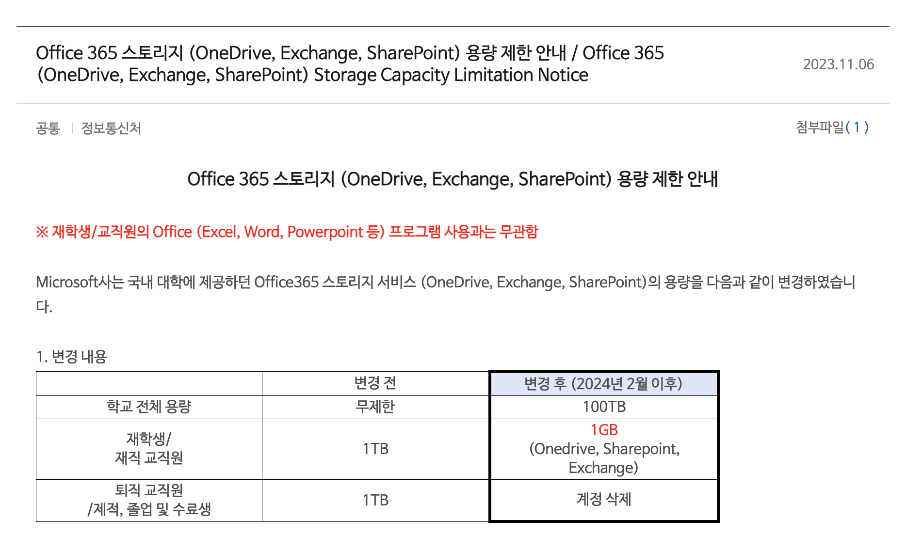 - 재학생 및 재직 교직원 개인 용량: 기존에는 1TB였던 것이 1GB로 줄어듭니다.