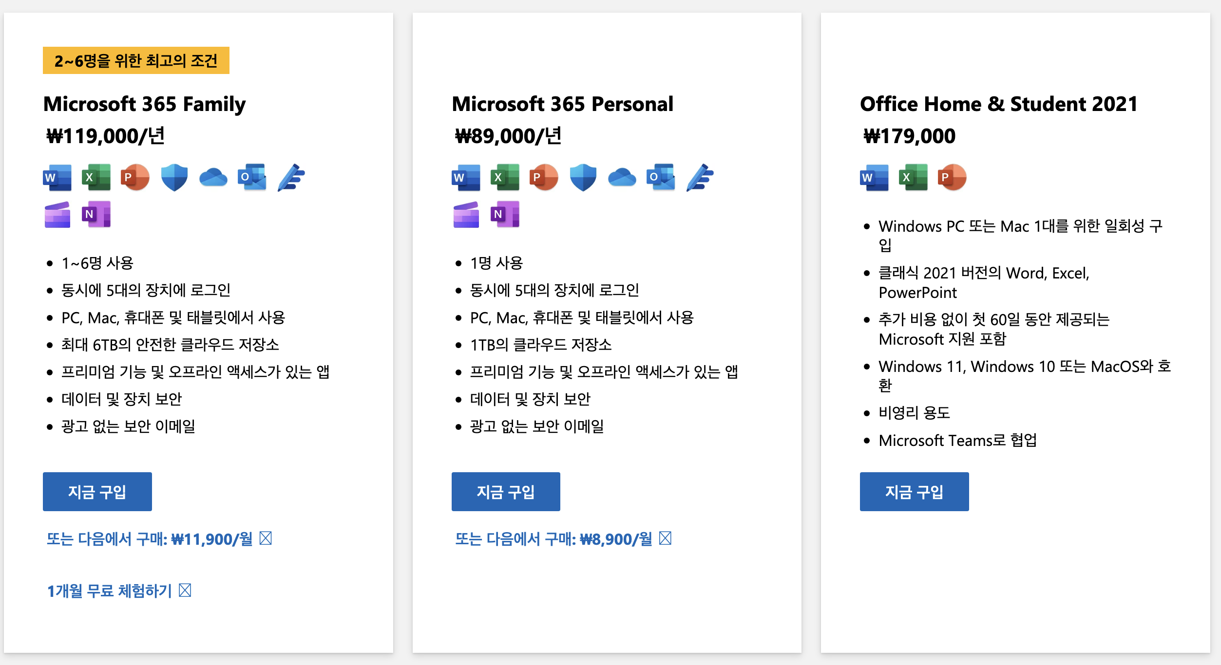 원드라이브, 워드, 엑셀, 파워포인트 등을 함께 쓰는 마이크로소프트 365를 유료로 사용하면 월 8,900원부터의 플랜이 있습니다.