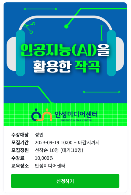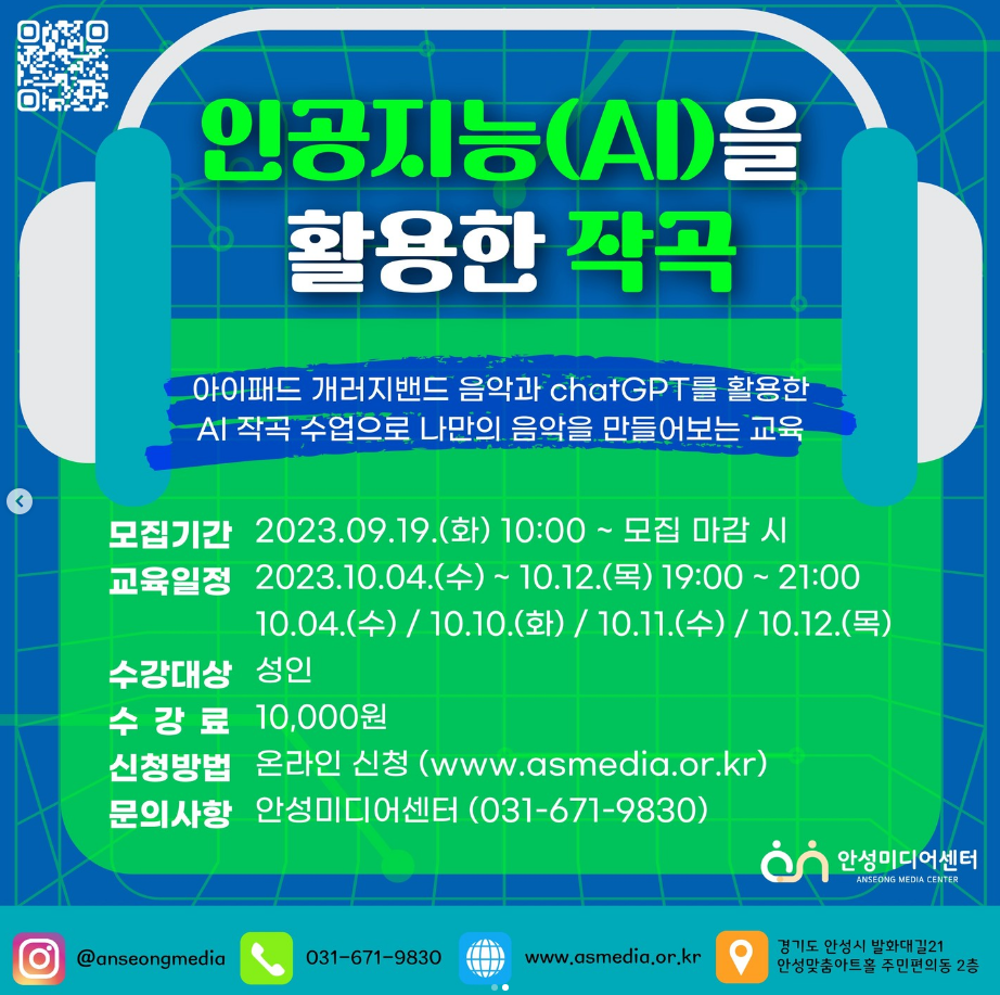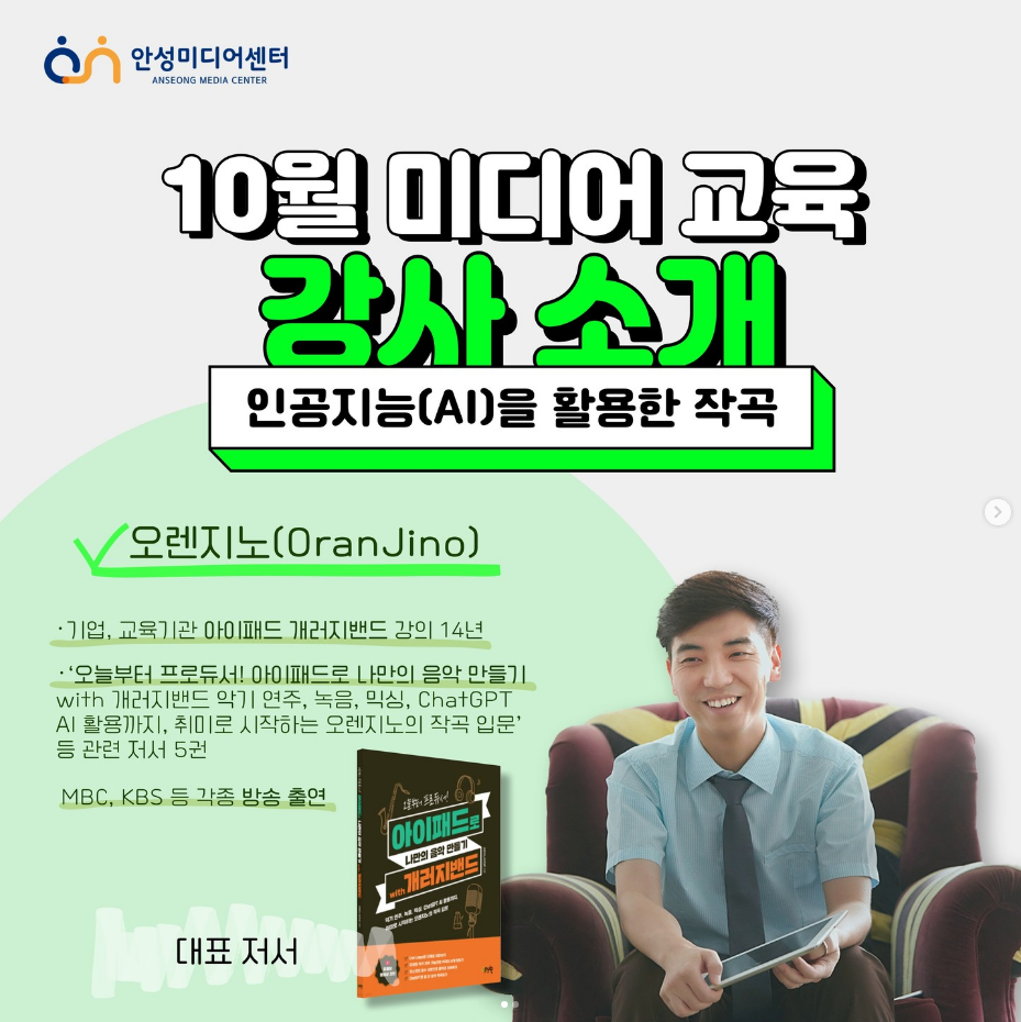 안성미디어센터 인스타그램에도 이렇게 강의를 알리고 있습니다. 신간 오늘부터 프로듀서! 아이패드로 나만의 음악 만들기 with 개러지밴드 - 악기 연주, 녹음, 믹싱, ChatGPT AI 활용까지, 취미로 시작하는 오렌지노의 작곡 입문서를 참고서적으로 한 강의인데, 강의 후에도 아이패드 개러지밴드 음악과 chatGPT AI 작곡을 더 잘 배우고 싶으시다면 교재가 있으시면 당연히 더 좋겠죠.