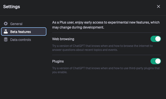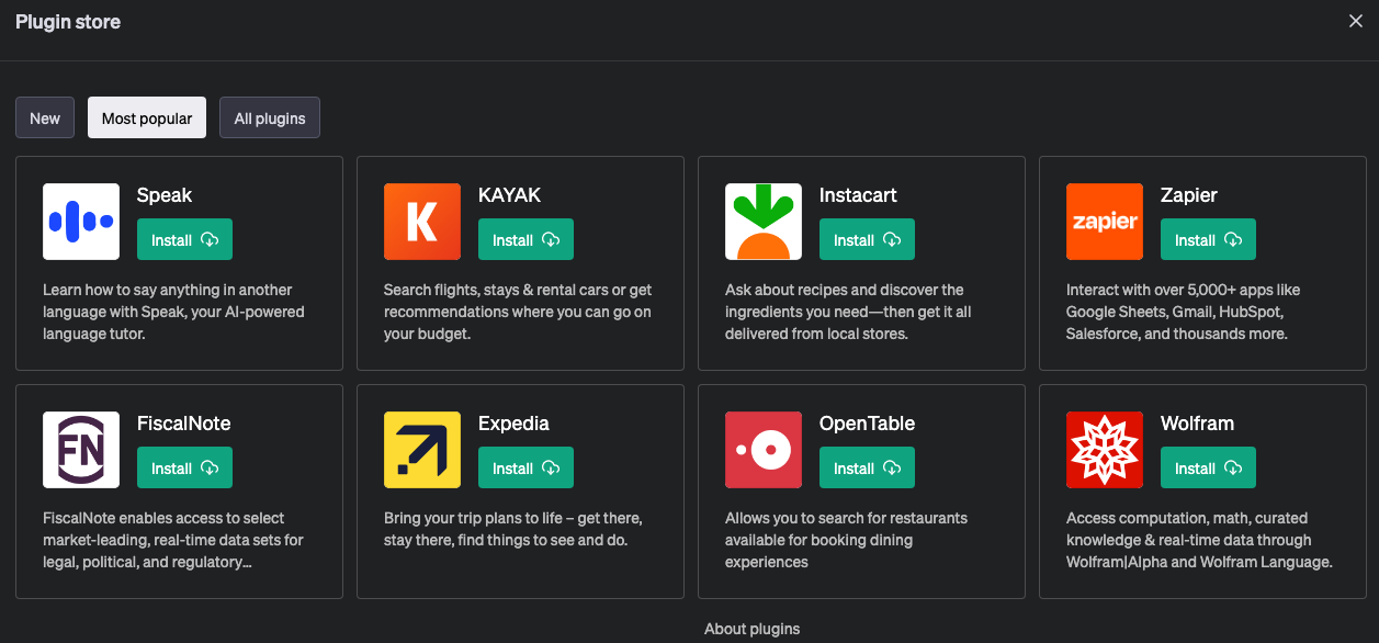 오픈AI 챗봇 chatGPT 플러그인 사용이 가능해졌습니다. 유료 사용자는 챗GPT 설정에서 플러그인을 활성화할 수 있게 되어있습니다. 인기 있는 챗GPT 플러그인은 Speak, KAYAK, Instacart, Zapier, FiscalNote, 익스피디아, 오픈테이블, Wolfram 등이 있습니다.