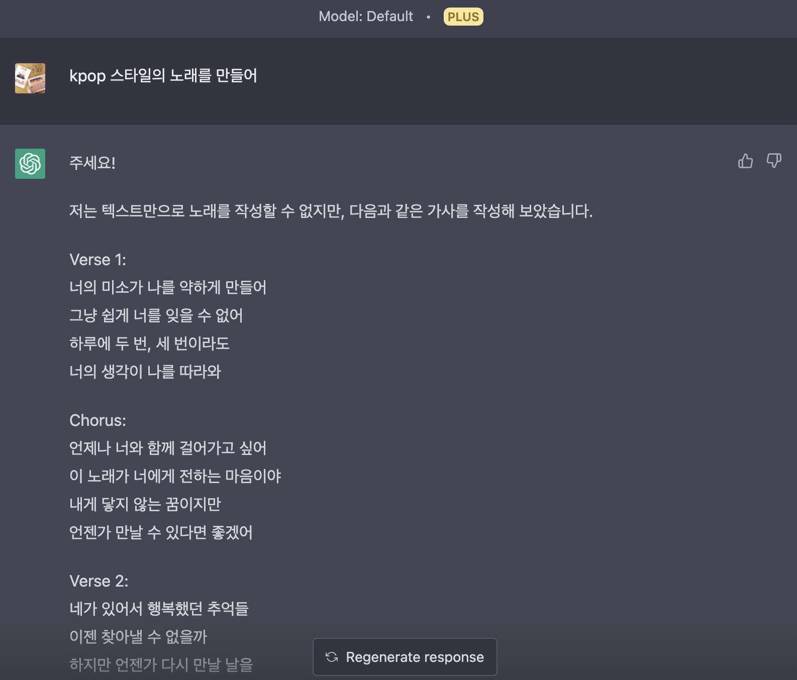일단 그동안의 chatGPT 한글 사용이 그리 만족스럽진 않았는데요, 플러스에선 어떨지 궁금해서 우선 kpop 스타일 노래를 만들어보라고 시켰습니다. 보통은 이렇게 가사를 써줍니다.