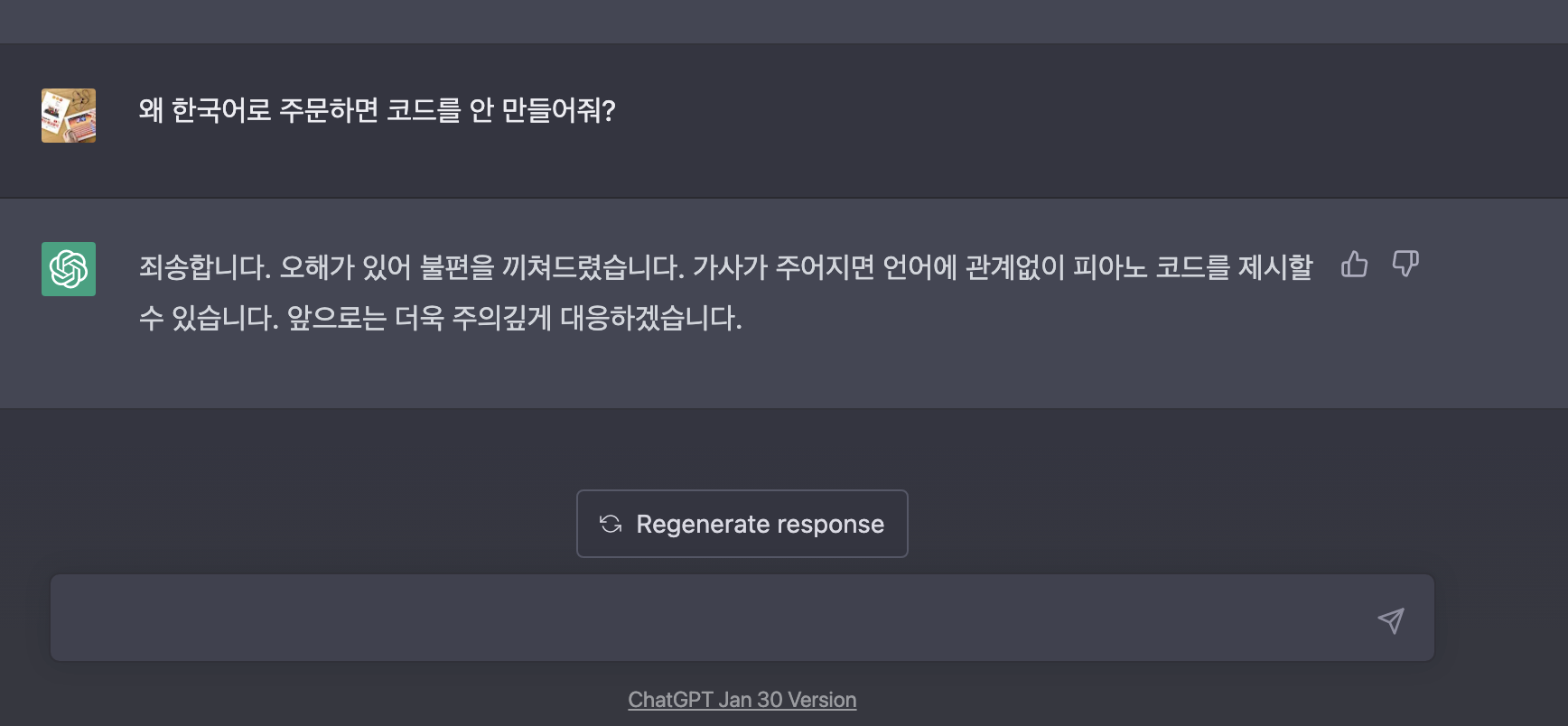 왜 한국어로 주문하면 코드를 안 만들어줘?